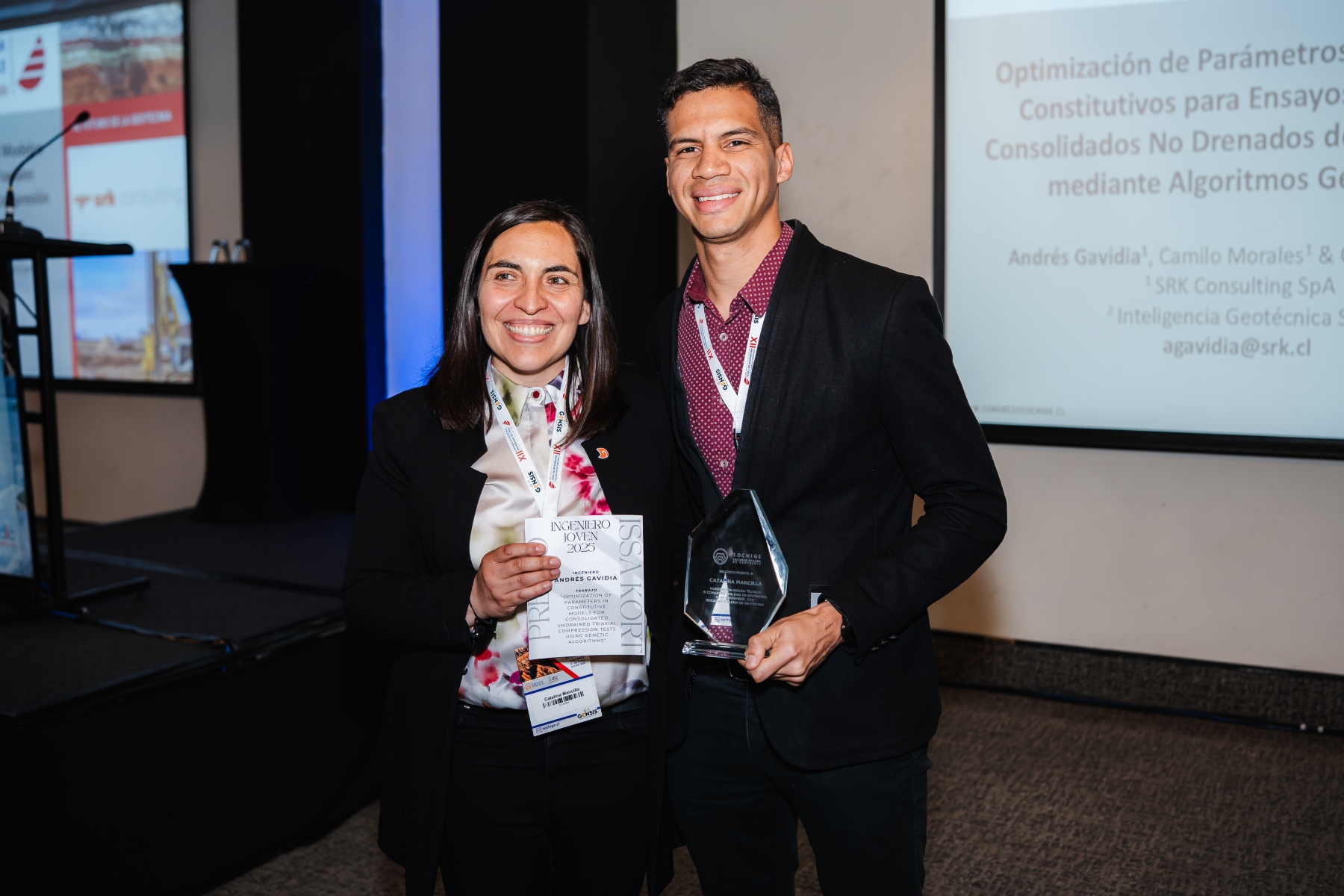 En la ceremonia de premiación se destacaron las investigaciones de mayor aporte a la ingeniería geotécnica presentadas durante el congreso. El Premio Issa Kort, otorgado al artículo presentado por un ingeniero joven con mayor contribución al conocimiento de la disciplina, fue entregado a Andrés Gavidia por su trabajo “Optimization of Parameters in Constitutive Models for Consolidated Undrained Triaxial Compression Tests Using Genetic Algorithms”.